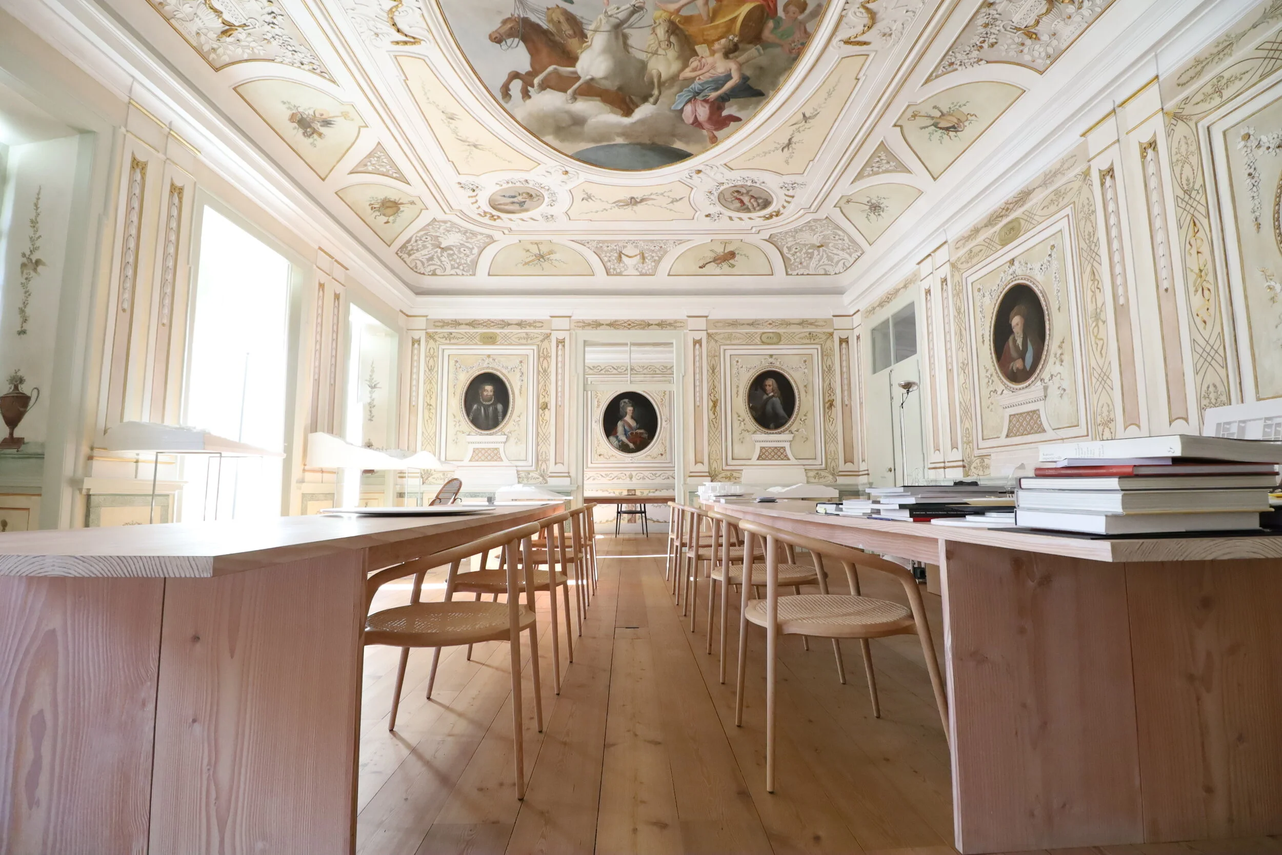 No seu interior, o novo atelier auto-desenhado dos arquitectos Aires Mateus, tem como principal característica as pinturas ornamentadas e os tectos decorativos em estuque. ” - publicado em Metalocos Megazine